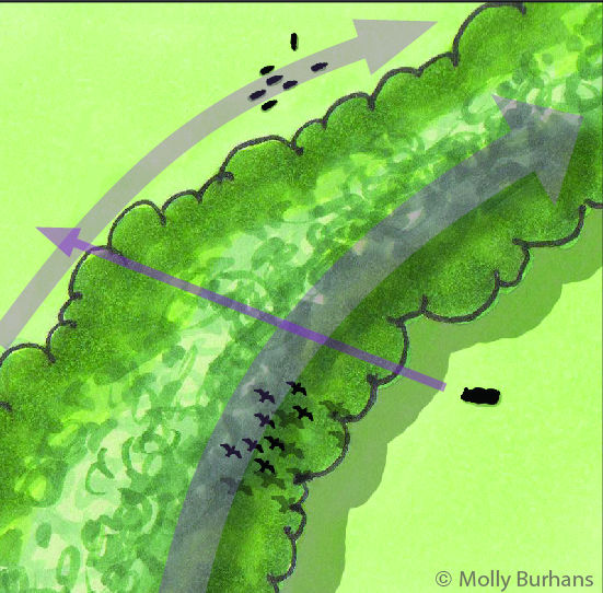 hedgerows influence airflow across agricultural landscapes, creating sheltered zones and reducing wind speed. The Venturi effect, where wind accelerates through narrow gaps, can occur between closely spaced hedgerows, affecting microclimates and soil stability. Proper hedgerow spacing and design can optimize these dynamics for ecological and agricultural benefits. [Inspired by the work of landscape ecologist Richard T.T. Forman]