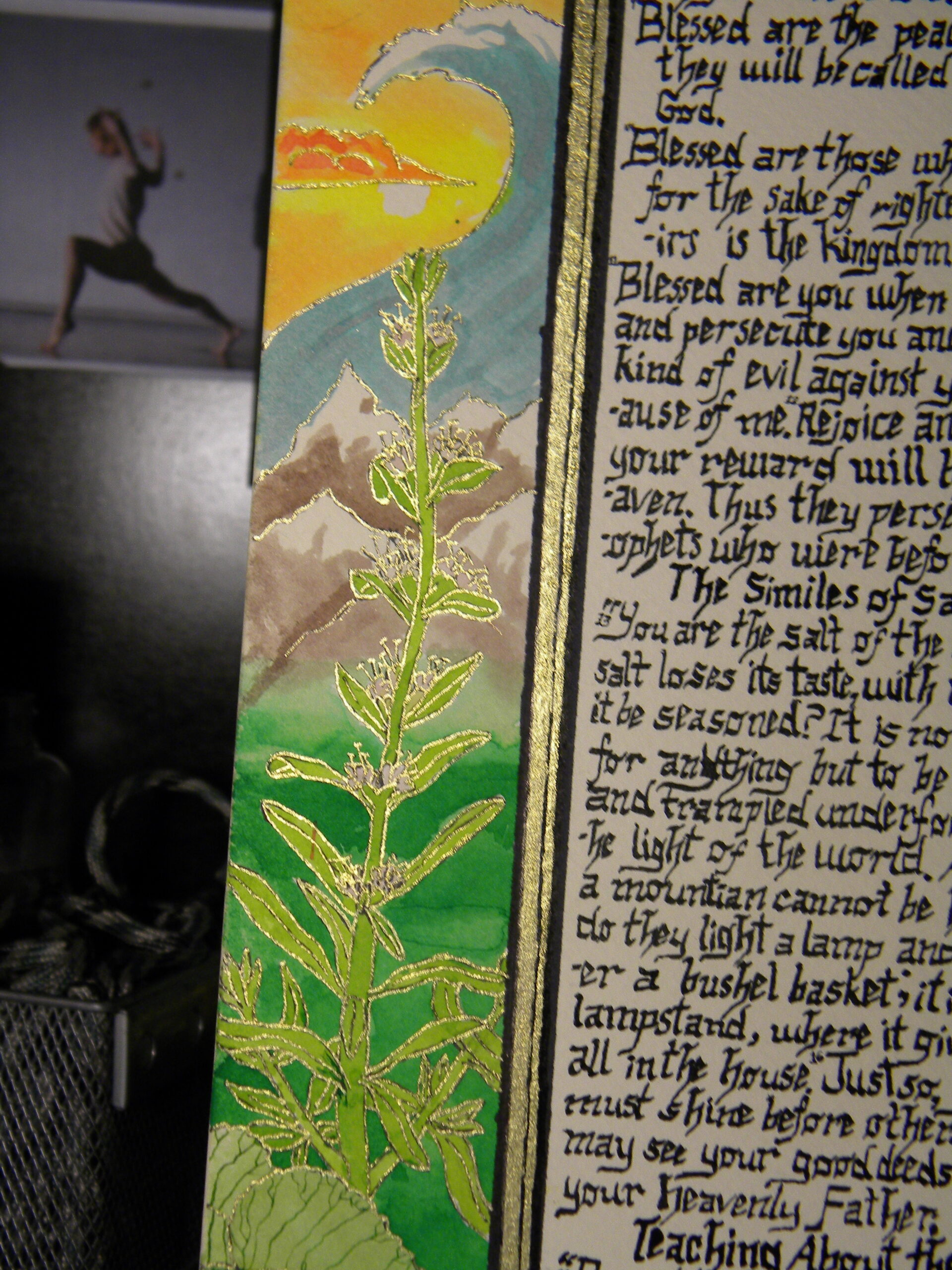 watercolor, calligraphy pen, brass suspended liquid, ink